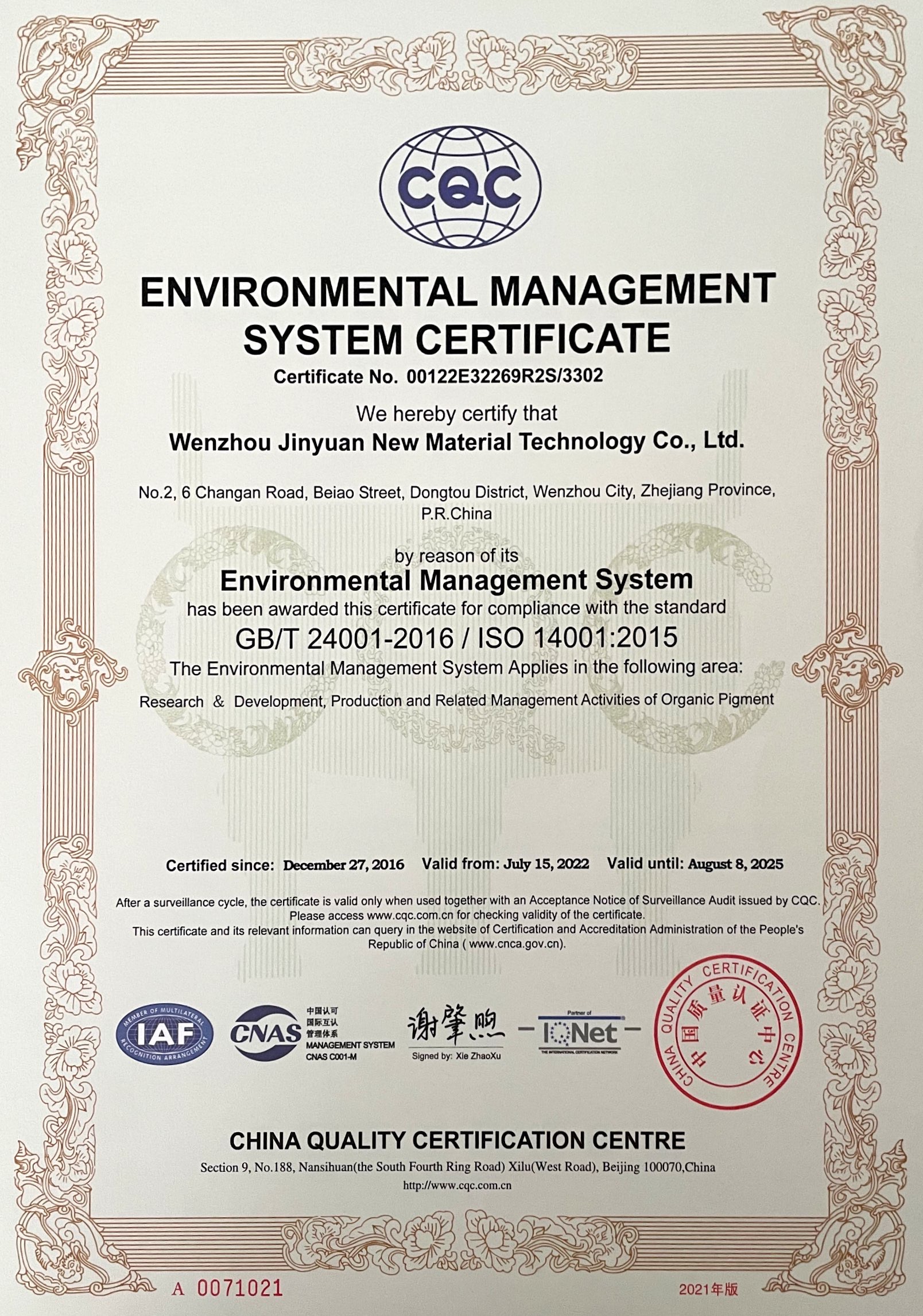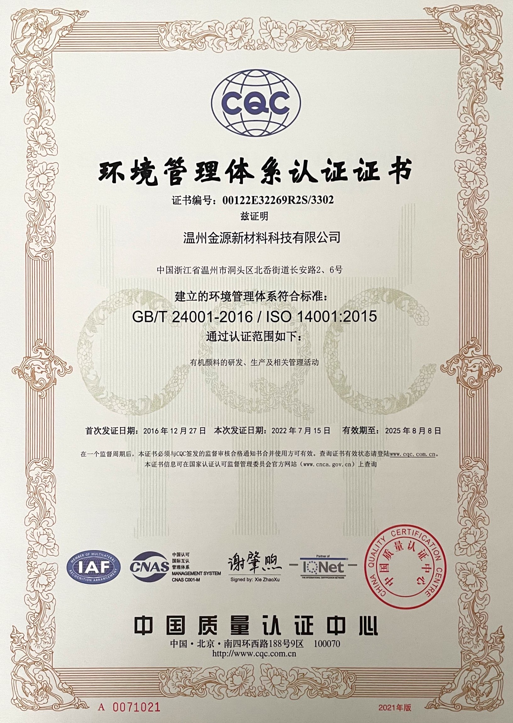 環(huán)境管理體系認(rèn)證證書